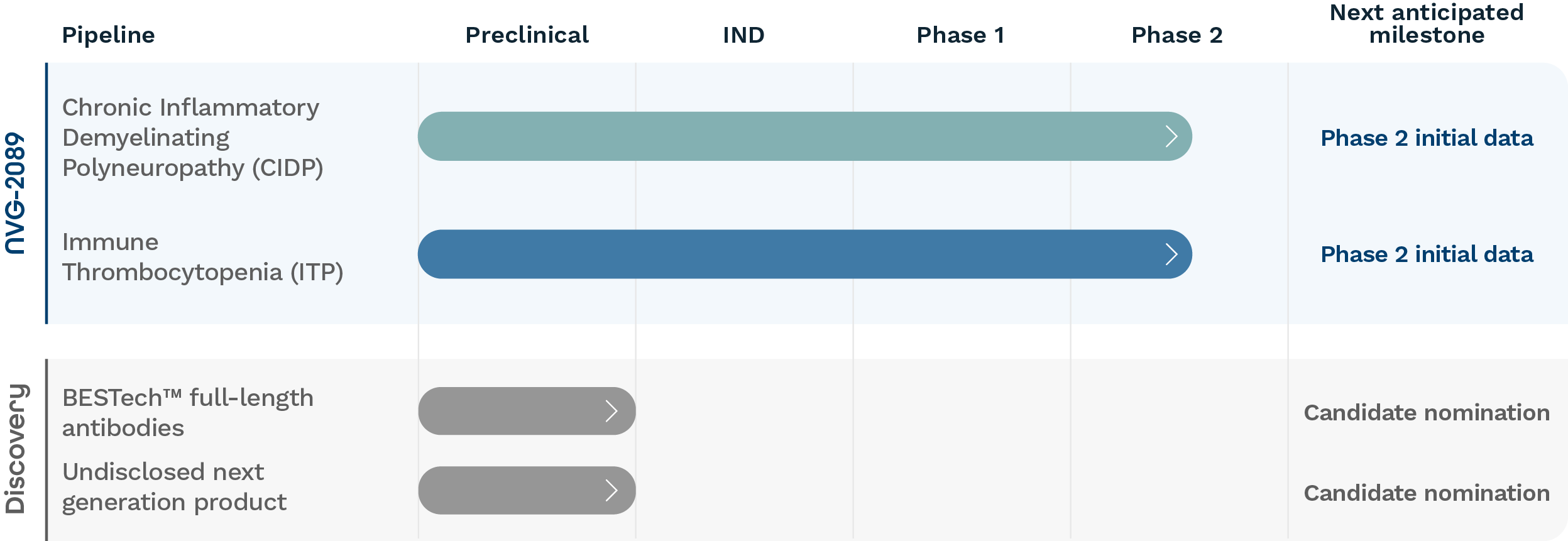 We aim to bring safe, efficacious immune-modulating therapies to patients with autoimmune disease. We are developing NVG-2089 to treat patients with unmet and severe neurologic and dermatologic autoimmune disease. Our next-generation BESTech™ platform promises to enhance the function of multiple clinically validated drug targets, improving existing treatment across a wide range of autoimmune diseases.